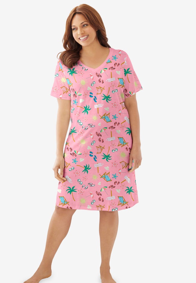 This Dreams & Co® women’s cotton knee-length sleepshirt delivers breathable, all-night comfort with a soft feel and a relaxed silhouette designed for sleeping or lounging. Featuring playful prints, a ribbed V-neck, and an easy A-line shape, it offers effortless style, coverage, and freedom of movement for bedtime and relaxed days at home.
