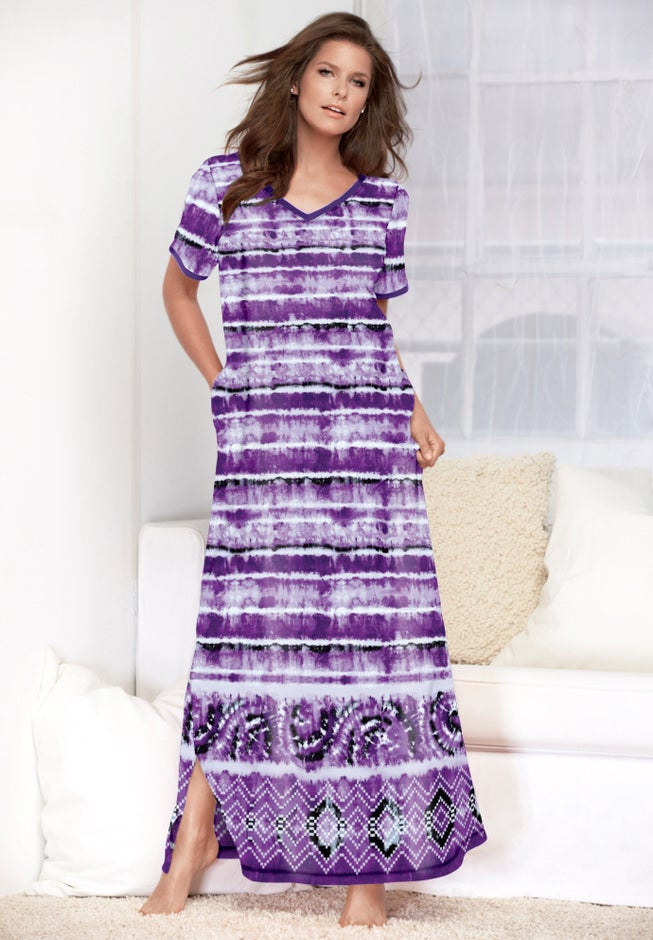 This Dreams & Co® women’s maxi lounge dress delivers effortless comfort and relaxed style, featuring a flattering V-neck, short sleeves, and an easy trapeze silhouette designed for all-day wear at home or on casual outings. With a soft cotton-blend knit fabric, added mobility, pockets and side slit, it offers a comfortable, confidence-boosting fit that moves with you.