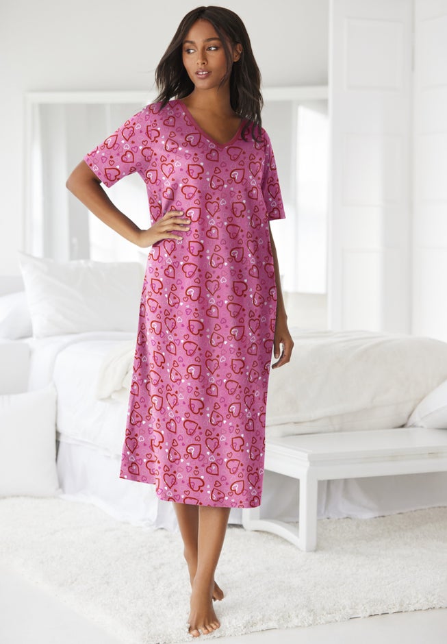 This Dreams & Co® women’s cotton midi print sleepshirt offers breathable, all-night comfort with a soft, cozy feel and a relaxed silhouette designed for sleeping or lounging. Featuring playful prints, a ribbed V-neck, and an easy A-line shape, it delivers effortless style, coverage, and freedom of movement for bedtime and beyond.