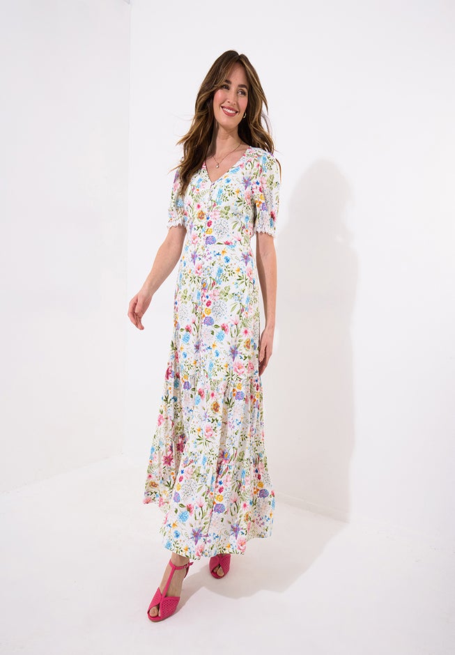 We’re obsessed with every detail of this dreamy floral dress. From the vintage-inspired frills and puff sleeves to the delicate button-front design, it’s made for making an entrance.