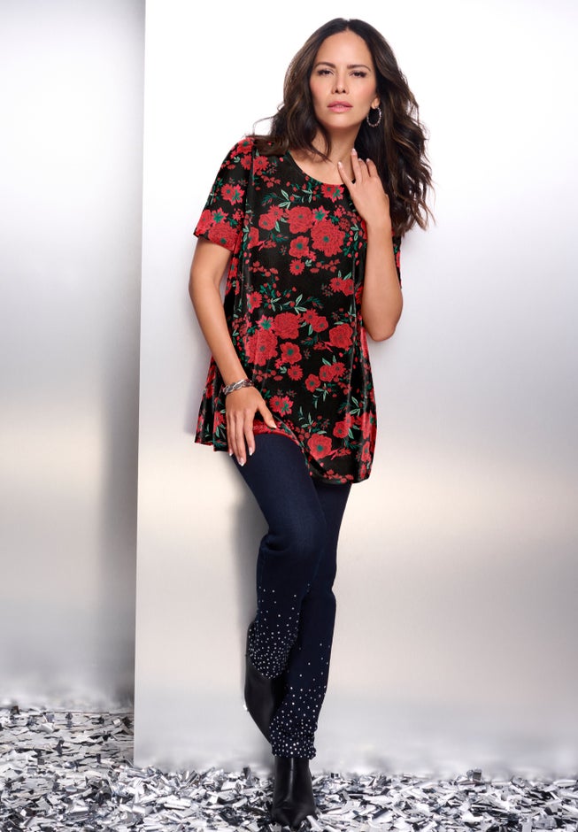 Item Number: 1039263Spoil yourself a bit with the rich color and luxe comfort with our Velour Swing Tee. Its plush, soft fabric keeps it comfortable to wear no matter the occasion. Pair it with leggings for a casual day out or with trousers for a more polished look.