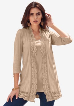 Whether it's a cool fall night or a laidback layer for weekend errands, our women's plus size cardigans will up your fashion game and keep you covered. From everyday styles to cutting edge trends, you'll find the best cardigans right here at Roaman's. Experiment with boho lace and fringe. Rack up the compliments with femme pointelle and crochet styles or make a statement in long dusters and military-inspired cardis. Get glam in sequins or cropped boleros. Go long with an ankle-grazing cardi or keep it short and sweet with a shrug. With so many cuts, lengths and styles to choose from, there's no excuse not to indulge.