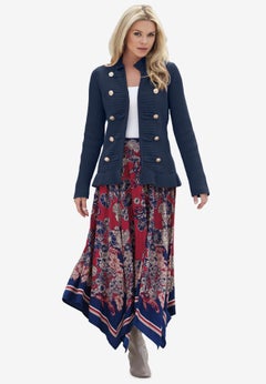 Whatever your shape, you'll find a cardigan at Roaman's that fits and flatters. Long cardigans and dusters flatter all body shapes. The longer length skims over the body and downplays any parts you'd rather not highlight. For those of us with a classic pear shape, choose a streamlined style that hits just above or below the hips, not across the widest part. Waterfall cardigans with a draped open front and an asymmetrical hem also lengthen and elongate. If you're blessed with an ample bust, go for a classic V-neck cardigan. The diagonal lines have a slimming effect. If you carry your weight in your tummy, try a straight cut cardigan or a long sweeping knit to draw attention away from your middle. Hourglass figures can wear almost every type of cardigan including shorter shrugs and chunkier knits as well as belted or peplum styles that accentuate your classic proportions.