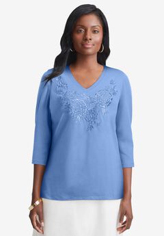 A versatile stretch cotton tee featuring a pretty embroidered V-neckline and elbow-length sleeves.