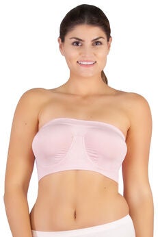 A pink molded seamless bra with pockets for breast forms and soft cushioned wider straps.
